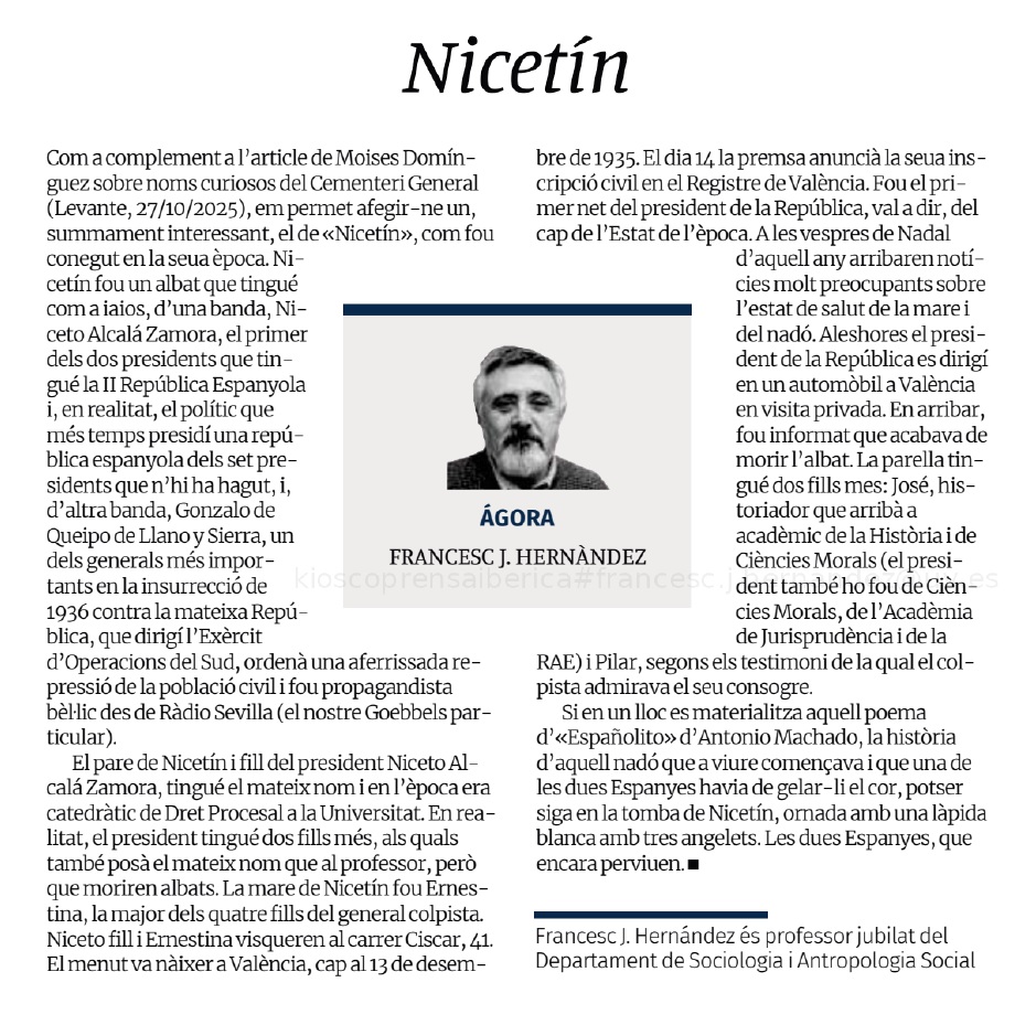 Com a complement a l’article de Moises Domínguez sobre noms curiosos del Cementeri General (Levante, 27/10/2025), em permet afegir-ne un, summament interessant, el de «Nicetín», com fou conegut en la seua època. Nicetín fou un albat que tingué com a iaios, d’una banda, Niceto Alcalá Zamora, el primer dels dos presidents que tingué la II República Espanyola i, en realitat, el polític que més temps presidí una república espanyola dels set presidents que n’hi ha hagut, i, d’altra banda, Gonzalo de Queipo de Llano y Sierra, un dels generals més importants en la insurrecció de 1936 contra la mateixa República, que dirigí l’Exèrcit d’Operacions del Sud, ordenà una aferrissada repressió de la població civil i fou propagandista bèl·lic des de Ràdio Sevilla (el nostre Goebbels particular).
